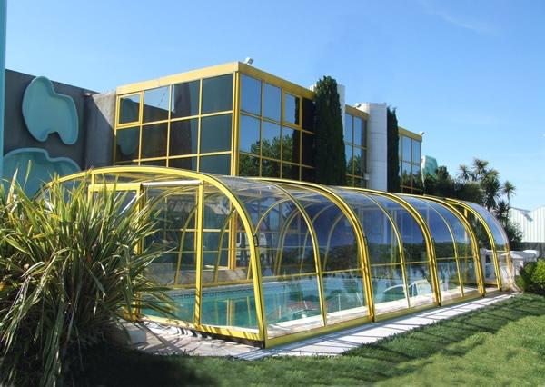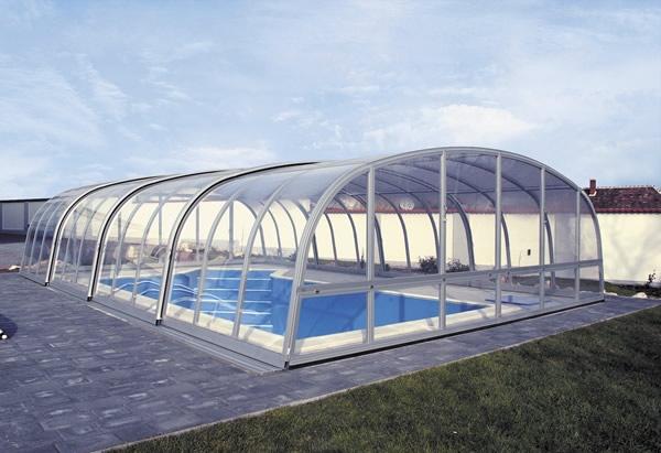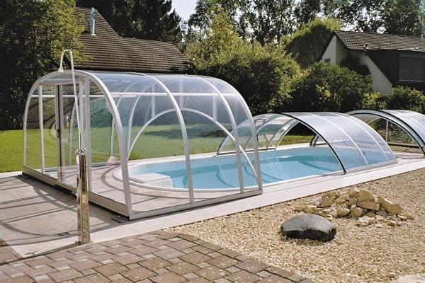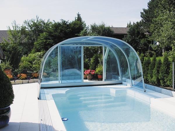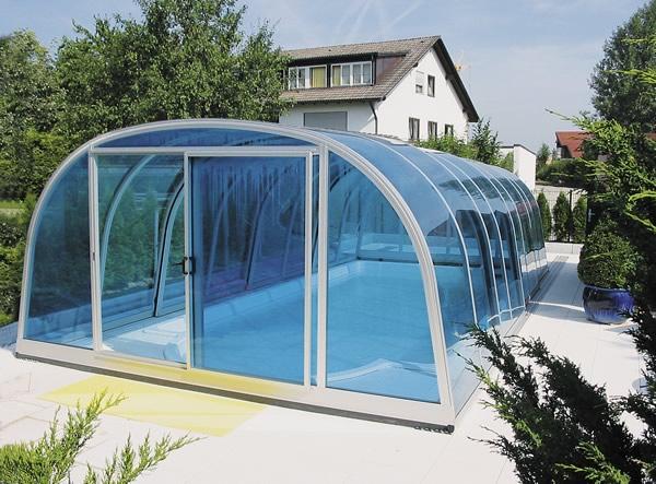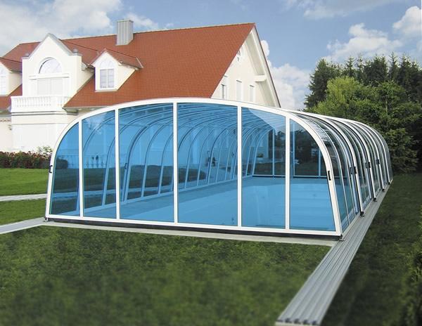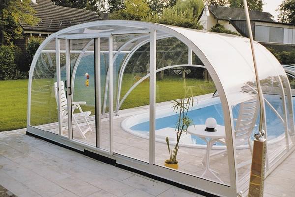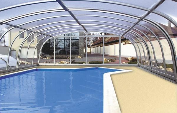 These models' main advantages are their spaciousness and very elegant and smooth lines. You can either swim or lounge underneath the cover (especially if the cover is longer than the pool itself) even in cooler or windy weather. Glazing is made of double-layer UV resistant polycarbonate panels with a thickness of 8 mm. Cover model range "Space" (all three models) is also suitable for enclosing porches and terraces.
