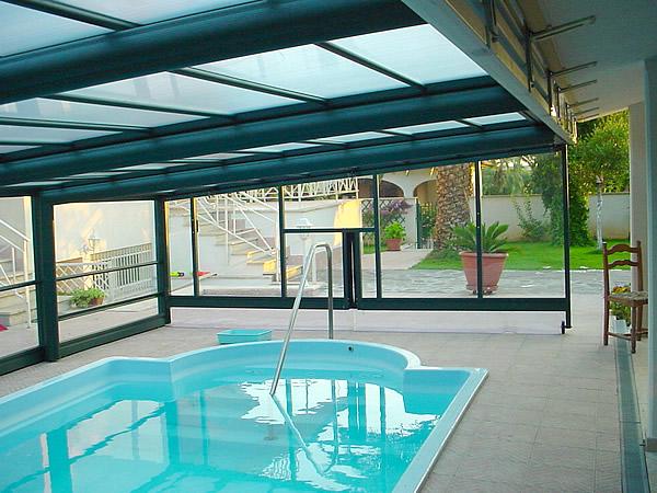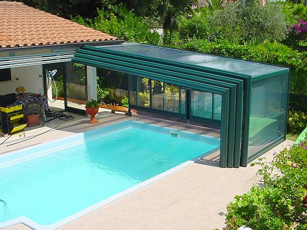 Mono 200-1The standard width of the MONO 200-1 pool cover is up to 5.5 m (outer measurements - see technical specifications) or more with strong profiles and for other versions. Upon special order, we can provide an offer for greater widths or suggest another type of pool cover. The pool cover height may also be lower or higher, depending on your requirements. All types of additional equipment are possible: any type of side glazing, the desired number of doors and windows, electric motor drive, (in special cases) special INOX rails for sliding the cover or tinted cover ceiling, etc. The cover design and dimensions are fully adaptable to your wishes and needs. For more details, see the technical specifications of STRONG LINE retractable covers. |